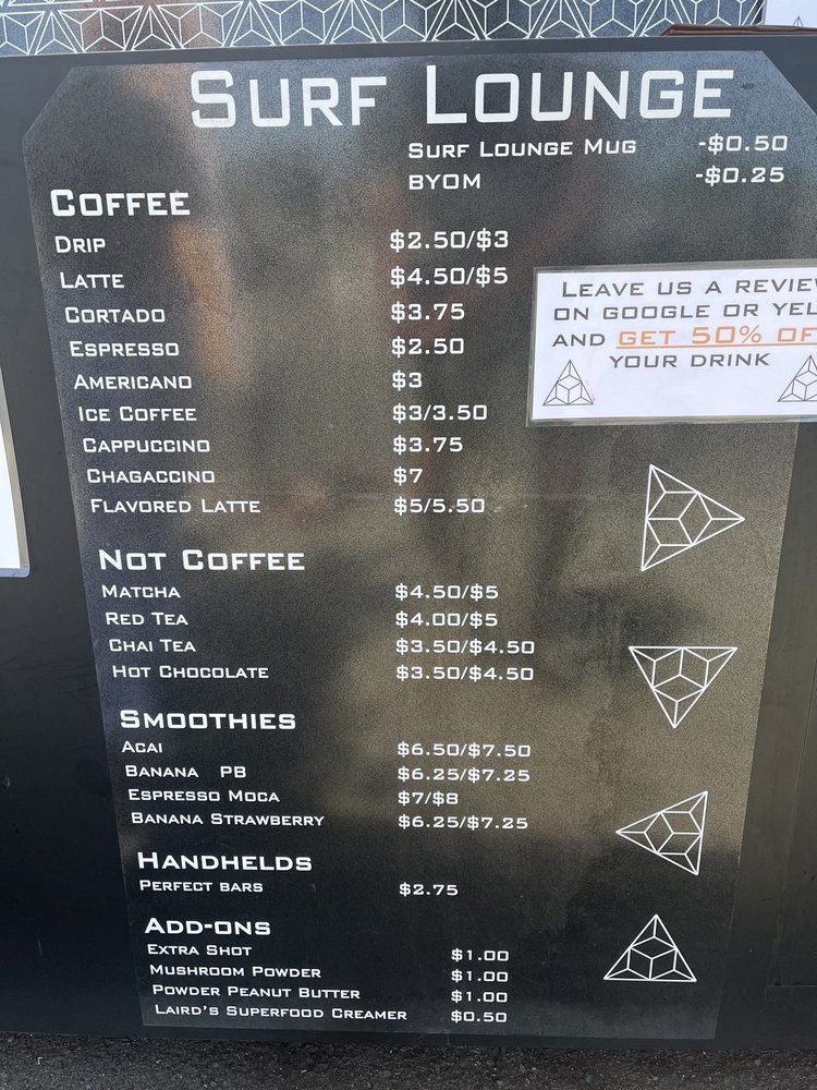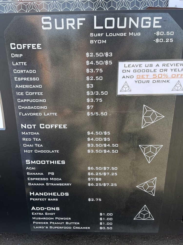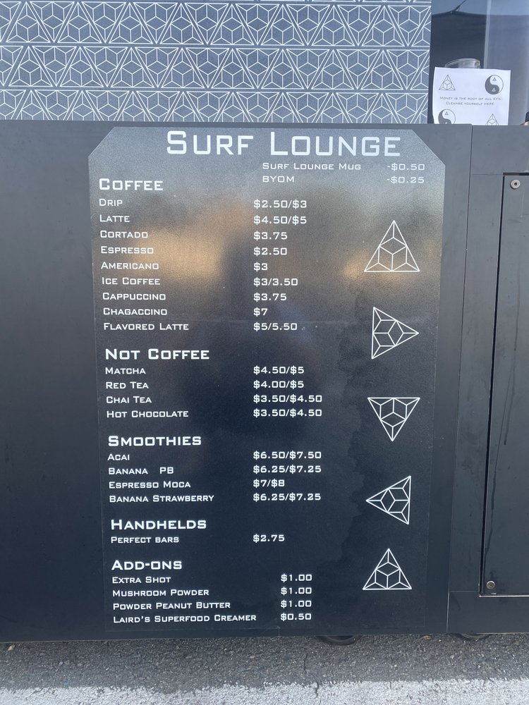 Welcome to Surf Lounge, a vibrant venue tucked away at 763 Turquoise St, San Diego. This eclectic space is not just a coffee shop; it's a paradise for surf lovers and food enthusiasts alike. The menu offers delightful items that fuse creativity with comfort. Try the Simple Man, a straightforward treat that hits the spot, or indulge in the rich flavors of the Banana Hammock, which is sure to satisfy your sweet tooth. For something unique, don’t miss the Get Em To The Ghee or the refreshing Chai Me A River drink.